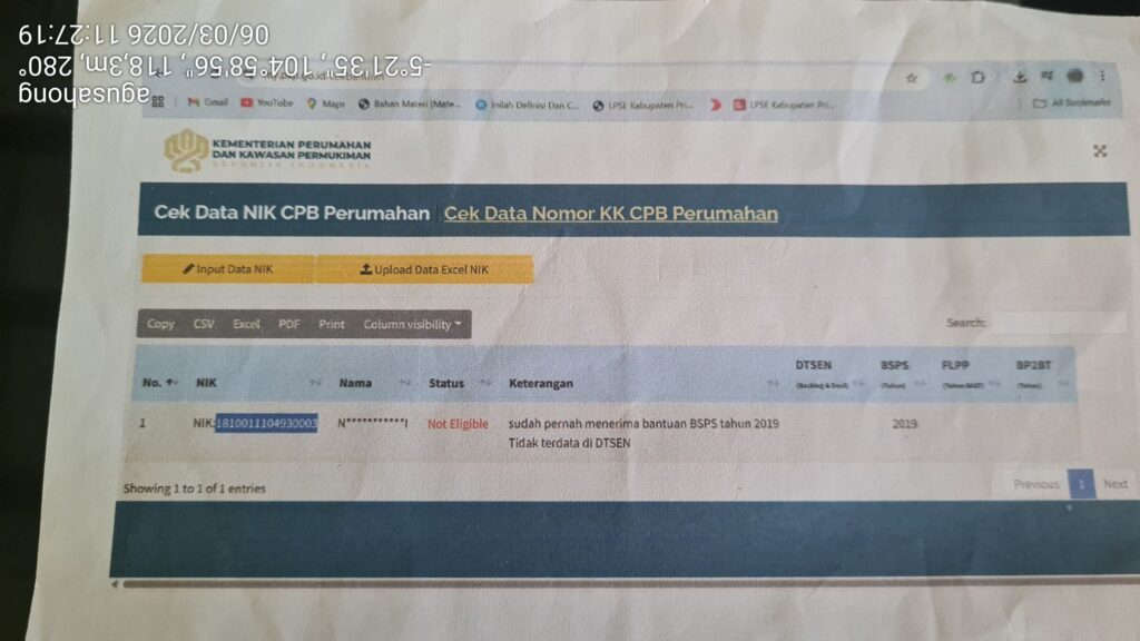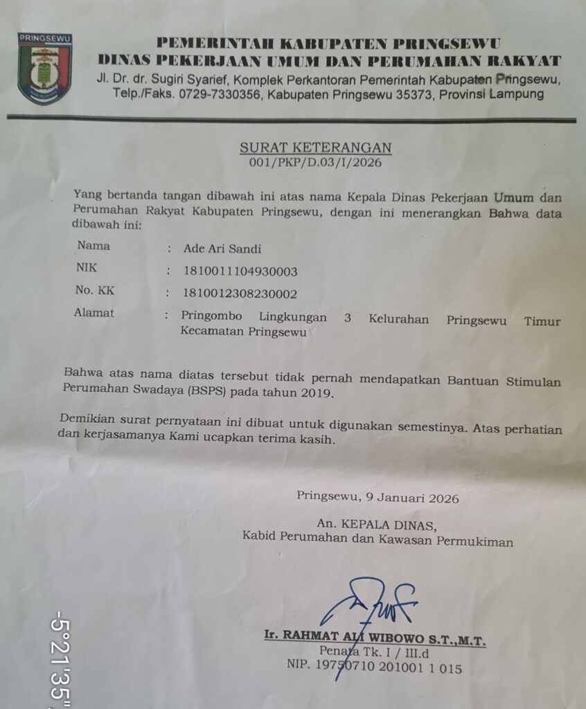 PRINGSEWU – Ade Arisandi, warga Pringsewu Timur, mengalami kesulitan saat mengajukan KPR Subsidi karena nomor induk KTP miliknya telah digunakan oleh orang yang tidak bertanggung jawab untuk mendapatkan bantuan BSPS (Bantuan Stimulan Perumahan Swadaya) pada tahun 2019. Ade sendiri tidak pernah menerima bantuan tersebut dan baru mengetahui masalah ini saat mengajukan KPR Subsidi.(8/3/26)